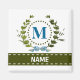 En ömtålig krans av murgröna med ett blått randigt band ligger över en fräsch vit bakgrund. Brölloppsanpassad design med monogram "M" i blått. Magneten kan personifieras med valfritt namn över det gröna bandet. Designtips: För teckensnittet som visas här, använd versaler för namnet.