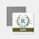 En ömtålig krans av murgröna med ett blått randigt band ligger över en fräsch vit bakgrund. Brölloppsanpassad design med monogram "R" i blått. Magneten kan anpassas med valfritt namn över det gröna bandet. Designtips: Använd versaler för namnet för den typsnitt som visas här.
