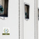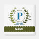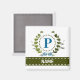 En ömtålig krans av murgröna med ett blått randigt band är lagd över en fräsch vit bakgrund. Brölloppsanpassad design med monogram "P" i blått. Magneten kan anpassas med valfritt namn över det gröna bandet. Designtips: För teckensnittet som visas här, använd versaler för namnet.