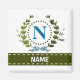 En ömtålig krans av murgröna med ett blått randigt band är lagd över en fräsch vit bakgrund. Bröllopstemat design innehåller monogrammet "N" i blått. Magneten kan anpassas med valfritt namn över det gröna bandet. Designtips: Använd versaler för namnet med den visade teckensnittet.