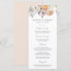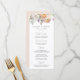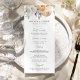 Elegant bröllopsmeny med blomstermotiv med en bukett av akvarellblommor och lövverk i nyanser av persika, elfenben, orange, rosafärgad, lila, gul och grön. Personalisera vårblommiga bröllopsmenyer med era namn, bröllopsdatum och menyinformation. Den fantastiska blomsterbröllopsmenyn är perfekt för vår- och sommarträdgårdsbröllop.