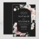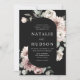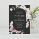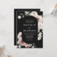 Eleganta vinterblomma bröllopsinbjudningar med dina bröllopsdetaljer visade i mörkgrön text inuti en oval blomster ram med svart bakgrund. Vinterblommorna har en färgpalett av dammig ros, ljusrosa, elfenben och mjuk gyllengul med eukalyptusblad och vinterlöv i nyanser av salvia grön och rik skog grön.