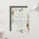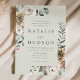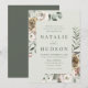 Eleganta vinterblommiga bröllopsinbjudningar med dina bröllopsdetaljer visade i mörkgrön text inuti en boho blomster ram med en ljusgrön bakgrund. Vinterblommorna har en färgpalett av dammig rosa, ljusrosa, elfenben och mjuk gyllene gul med eukalyptusblad och vinterlövverk i nyanser av grönsalvia och rik skogsgrön.