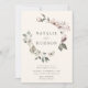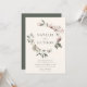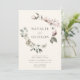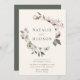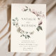 Eleganta vinterblommiga bröllopsinbjudningar med era namn omgivna av en krans av akvarellblommor och lövverk med en elfenbensvit bakgrund. Vinterblommorna har en färgpalett av dammig rosa, ljusrosa, elfenben och mjuk gyllengul med eukalyptusblad och vinterlövverk i nyanser av salvia grön och rik skogsgrön.