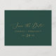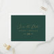 Detta känsliga guld- och gröna spara datum vykort är perfekt för ett modernt bröllop. Den romantiska minimalistiska designen har vacker och elegant champagne-gul typografi på en smaragdgrön bakgrund med en ren och enkel look.