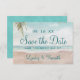Ön Breeze Paweed Beach Scene, med Ocean Vågar, Sandy Beach och Handflatan Träd, med ett vackert teal blå himmel. Med Typsnitt för modern typografi. En tropisk sommarströ, eller en målbröllopsdesign - Personlig Bröllop spara datum-kort! ~ Kolla min butik för att se hela bröllop-svit för den här designen!