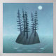 En avlägsen ö mitten i havet med gräs träd. Måne skiner på denna fredliga scen, och äventyrskoncerner! Sjölandskapets ursprungliga målning av Nic Squirrell.