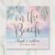 These custom favor tags feature a pastel watercolor beach scene on the front, with a soft sunset in shades of pink, purple, and teal blue. Palm tree fronds frame the top, adding a tropical and elegant touch. “On The Beach” appears in flowing script, with the couple’s names and wedding date below in a clean serif font for a polished and balanced look.
