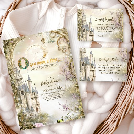 A classic fairytale-inspired design featuring an elegant storybook castle, soft florals, and magical details reminiscent of a timeless fairy tale. The dreamy parchment background and whimsical illustration create an enchanting, storybook atmosphere perfect for celebrating a little princess on the way. Fully customizable and ideal for elegant, fairytale-themed celebrations.