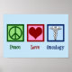 En vacker onkolog poster med ett fredstecken, ett hjärta och medicinaltecknet. Peace Kärlek Oncology. Stöd det underbara läkare i fält för att bota och hjälpa cancerpatienter.