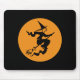 En svart ond häxa som framme flyger av en orange Halloween måne på henne kvasten.