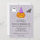 Den här är till alla som har födelsedag strax före eller på Halloween-dagen, och kan användas för personer i alla åldrar trots några av de söta elementen. Huvudfokus för den här är jack-o-lanternen som bär på en festhatt. Kortet har anpassningsbara element som kan ändras med hjälp av den blå "Anpassa denna design"-knappen. Du kan ändra personens namn och ålder, datum och tid för festen, festens plats och RSVP-information.