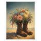 A imagem retrata um par de botas de caminhada, símbolos da jornada e da resiliência, servindo de base para um arranjo floral exuberante. É uma representação visual de como o cuidado, a paciência e a terapia podem transformar o peso do dia a dia em algo leve e florido. As tesouras ao lado remetem ao trabalho manual, ao "cortar e refazer" que faz parte de qualquer processo de cura.