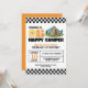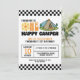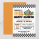 Celebrate your one happy dude with this retro 70s groovy one first birthday invitation. This design perfectly blends a camping theme with a vintage aesthetic, featuring a bold black and white checkered border and an eye-catching tent and sun graphic.