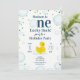 "Ett Lucky Anka" första födelsedagsfest med gummi anka omgivet av blått och grönt konetti, bubblor och blått.