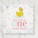 "Ett Lucky Anka"-tema med första födelsedagsfesten som innehåller gummi anka med rosa omgiven av rosa konetti, bubblor och rosa text.