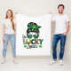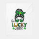 Det här är en roligt filt som firar St. Patrick's Day med en design som visar en kvinna med hår i en bun med solglasögon och ord "One Lucky Lassie".