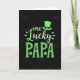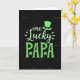This card features the phrase “one Lucky PAPA” centered on a deep black background, with lime-green lettering that glows against the dark. “one Lucky” sits above in a flowing, cursive-style line, giving the words a gentle, affectionate feel, like a soft note meant just for him 💚. A small leprechaun hat rests above the word “one,” tipped slightly as if it’s winking at the reader, complete with a simple buckle. “PAPA” is placed beneath in large capital letters, heavier and steadier, like a strong base under the lighter line above. Little four-leaf clovers are tucked into the openings of the A’s, adding a quiet nod to luck and a sweet, family-forward touch ☘️. The high contrast between the black field and the green text keeps everything crisp and easy to read, with the message staying right in the middle of the design. In the background, a faint grid and soft clover outlines drift across the black, adding depth without pulling attention from the central text and hat.