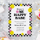 En roligt och en lysande första födelsedag-inbjudan för flickor med gult och rosa som leker ansikte ikoner och svart schaktat gräns. "Ett lycklig-babe" är i ett groovy, återteckensnitt. Om ni vill ändra den här texten, kontakta mig så kommer jag att göra uppdateringar utan kostnad för extra. Kortets baksida har ett rosa och vitt styrt mönster som kostymer reflexen. Alla färg är redigerbara!
