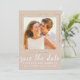 Elegant och chic guld, och elfenbenspalett färg. Ditt foto omges av ett guld ram med en modern elfenbensvit punkt mönster på insida. Spara datumet i ett vackert skript. Namn, datum och plats för bröllop följer. vykortet är bakåt i samma vita punkt på mönster. Era uppgifter om bröllop ligger i den bakgrunden, som också omges av ett ram i guld.