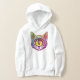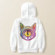 The hoodie has a one yellow eyed cat on the front and black, the cat had a few brilliant colors that make this sweat shirt stand out.