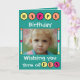 Anpassa det här hälsningskortet för ett barns födelsedag. Grattis på födelsedagen-kort för barn. Jag önskar dig massor av roligt. Byt ut fotot mot ditt eget, lägg till ett namn inuti och ditt eget meddelande. Gult, orange och rosa på gröntens bakgrund.
