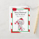 Den beundransvärda lilla hand plockade-musen i en julhatt som håller ett candy cane-vismiskt vykort. Lägg bara till ditt namn- och personlig-meddelande i personaliseringsområdet. Söt grönt och rött kort med snöflingor bakgrund.