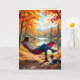 Söt Fall-temat kort med en illustration av en kvinna som slappnar av i en hammock och en bakgrund av orange Höst löv som reflekterar i en liten damm. En hund slingrar sig på marken bredvid henne.