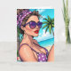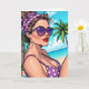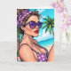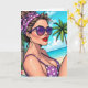 Ett kort för roligt som vill önska någon en sommar i lycklig för en vän med söt dam i en lila polka prima bikini på stranden i den tropiska tecknaden bok stil.