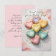 Vi presenterar vårt förtjusande anpassningsbara platta gratulationskort, perfekt för att skicka hjärtliga meddelanden till dina nära och kära. Framsidan av kortet har en charmig design med sju vackert dekorerade hjärtformade kakor i pastellfärger, arrangerade i ett visuellt tilltalande mönster. Varje kaka är prydd med invecklad icingdetalj, vilket ger kortet en touch av elegans och sötma. Texten på framsidan lyder "Sweet Wishes for a Lovely Day!" i en graciös, handskriven font, som perfekt kompletterar den lekfulla designen.
