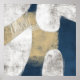 En stor abstrakt i marint blått täcker arbetsytan kant till kant med skärningar som visar en texturerad vit bakgrund. Ett slitet, texturerat beige område sitter över den blå formen medan vitt linjer vrider som rep i ett dynamiskt avsluta till biet.