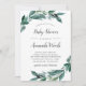 Elegantens botaniska babyduschinbjudningar har en chic färg-palett av skoglig grönt, bläcksvart och skarp vit. Din babyduschinformation är full av grönt grenar och löv i en pulserande målad vattenfärg stil.