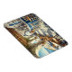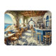 Perfekt för resan och kaffe älskare. Vattenfärgsmålningen skildrar den stilla och idylliska charmen i en öppen kaffebryggare i luft i Santorini. Utrymmet har blåaktiga väggar med blå accenter och bågöppningar som ram sprider ljus över det mousserande Egeiska havet. Träet bord med korgstolar är utspridda i hela området, som var och en är försedd med vas av vibranta bougainvillea-blommor. En natursten visningar en traditionell grekisk kaffekanna, pastejer och en vintage espresso maskin. En träpergola som är skrapad med spolviner ger delvis skugga och skapar bländat solljus på golv som är uppdelat på stenar. Patroner sitter på ett lugnt sätt, sippar kaffe och antingen blickar de ut i havet eller deltar i ett tyst samtal. Santorinis ikoniska vita och blå färg harmoniserar på ett vackert sätt med omgivningens skönhet.
