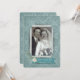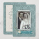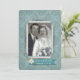 Öppet hus för alla bröllopsjubileer med skräddarsydd fotoram av paret. Bakgrunden är gnistrande teal-damask med hörnslitsram och bukett.