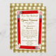 En inbjudan som presenterar en brun ginghambakgrund beklär och drar tillbaka på. Bekläda särdrag röda ritar ordnat i en rektangel formar med ren vit centrerar. Personifiera med lärare namn, klassen, läge och datera av din öppna husriktning för back to school.