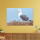Ett westernt fiskmås med vit och grått-välling står på ett klippt kant, dess näbba är öppen i ett högljutt samtal. Fågans huvud lutas tillbaka och avslöjar en skarp gult med en antydan av orange inuti. Fiskmås-kroppen står mot högerna av bilden, med sitt vingar inklämt mot baksidan.
