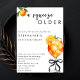 Orange Aperol Spritz Födelsedagsinbjudan - En elegant, enkel och chic födelsedagsfest med tema Aperol Spritz. Med en uppfriskande orange cocktail spritz med en orange skiva och mynta garnering bunden med en svart kokett slinga. Inbjudan lyder "En squeeze äldre". På baksidan hittar du en rolig orange. Anpassa denna redigerbara mall för vuxnas födelsedagsfest med dina egna evenemangsuppgifter. Tillgänglig för utskrift eller som en direkt digital nedladdning, lätt att skicka via e-post, sms eller sociala medier. Perfekt för en 30-årsfest, 40-årsfirande, 50-års födelsedagsfest eller 60-års jubileumscocktailparty.