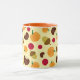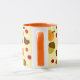 I orangen har kaffet mugg en färgstark höstskörd i mönster med pumpor, tranbär, akorns och kastanjer på en beige bakgrund. Underbar gåva till fall och Thanksgiving!