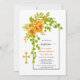 Orange vattenfärgsblommor och bågfall är baptisminbjudan. Den här fina designen har ett bågstycke ram med orange cactus blommor och grönt löv i det övre lämnat hörnet och i guld kor. Uttrycket "baptism" finns i manustypografi.