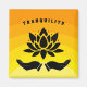 Lotus blomma är en symbol för inre fred, återfödelse och styrka. Ett stiliserat lotus används här i silhuett med upphöjt händer och ord TRANQUILITY (redigerbar text). Bakgrunden har skuggor av gult och orange för att förmedla intensitet och glädje.