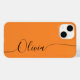 Orange Black Elegant Calligraphy Script Anpassningsbar Personlig Namn iPhone 14 Smart Phone Case har en modern och enkel design för trendig och snyggt med personligen namn i elegant i orange-handskriven calligraphy-skripttypografi på bakgrund. Designad av ©Evco Studio www.zazzle.com/store/evcostudio