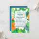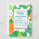 Ett inbjudningskort för möhippan med ett färglöst citrustema som dekoreras med orangar och vita blommar av orange med emerald grönt löv och indigoblå accenter som är färgade med vattenfärg och indigoblått på baksidan. Du kan redigera texten efter behov.