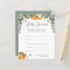 Låt babyduschgästerna ta sina bästa gissningar på baby födelsedatum och tid, vikt och längd! Ställe en stapel vid ingången till evenemanget, skicka runt dem eller lämna en vid varje ställe-inställning. Gör att roligten också är viktig för mamman när den kompileras i en söt box eller binder. Designad för att matcha vår Orange Blommar Honungsduschingsamling inspirerade den här sommaren till utformningen av grönt vattenfärgsblad, ett burk av honung och små honungsbeeillustrationer. Anpassa till mor för att vara namn och babydusch längs grund.