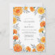 This design features a vibrant border of lush orange blossoms, reminiscent of marigolds, intertwined with delicate gray foliage. The artwork evokes a warm, cheerful, and slightly rustic ambiance, perfect for a late summer or early autumn celebration. The floral arrangement creates an inviting and romantic mood.