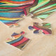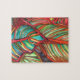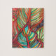 med original konstdesign från akvarellmålning av abstrakta orange och gröna Canna blad av konstnären Sacha Grossel. Dessa ljusa och färgrika botaniska blad har iögonfallande geometriska mönster och är inspirerade av botanisk konst och abstrakt konst. Naturen blir abstrakt genom den intensiva färgen och mönstret i denna blomsterdesign.
