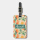 Ett bagagemärke med en reflex. Ett mönster som består av skivade orangar, hela orangar, grönt löv och vita blommar.
