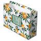 Present gifts in style with this elegant watercolor citrus gift bag. Featuring hand painted oranges, delicate orange blossoms, and lush green leaves on a crisp white background, it includes a soft green border framing a customizable monogram and name for a personal and sophisticated touch.