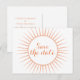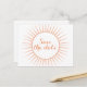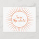 Sofistikerad och elegant Deco Retro Spara datum postkort i orange med en cirkulär art deco ornamenterad solstrålning design. Lätt att anpassa, lägg bara till din bröllopsinformation i de tillgängliga textfälten. Klicka på "Anpassa" för att hitta fler anpassningsalternativ.