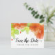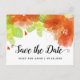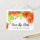Handskrivet skript kalligrafi och orange eteriska blommor blommigt faller bröllop Spara datumvykortet. Överdelen täcks med blommor av söt orange och löv av grönt.