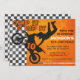 Fira awesomely, ytterlighetfödelsedagen med denna rad-motocrossinbjudan! Presenterar en grå färg- och orangegrunge och rutig bakgrund med en silhouette av en biker som gör ett sött trick!